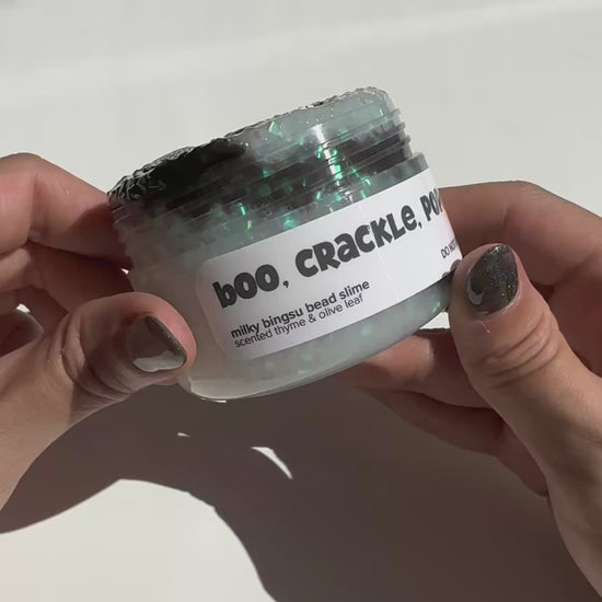 Milky bingsu alert! Dual-coloured in a black and white milky clear slime, with iridescent bingsu beads, scented thyme and olive leaf. It's a crunchy bingsu slime that is a touch softer due to its milky clear base and a fun one to mix.