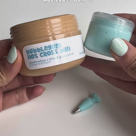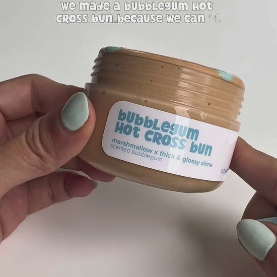 This Bubblegum Hot Cross Bun features a thick, squishy marshmallow base in a warm bun shade, and comes with an extra pigeon blue thick & glossy slime to create your own “icing” cross for an iconic hot cross bun moment.