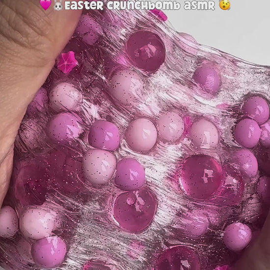 This glossy clear slime is loaded with jumbo beads, guntil beads and glitter for maximum crunch and crisp bubble pops. The stretchy base keeps everything coated and clicky, while the mix of textures creates that addictive squeeze-and-pull sound. An ASMR wonderland!